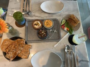 野菜中心のヘルシーなオリジナルメニューが多く、ドリンクの種類も豊富です。私のお気に入りはシナモンとショウガのソーダ。食後だったので軽く中東料理を食べました。本格的でおいしいです。和食に小鉢を添えたセットメニューもあります。