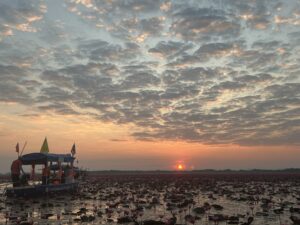 ウドンタニ(タイの東北地方、バンコクから飛行機で1時間)に前日に入り、朝の4時半に起きて身支度をしてホテルを出発、車で40分かけてノンハン湖に5:30に到着、すでに数人並んでました。日の出と蓮をボートから見るには、第一便ボートに乗らなくてならず、30隻ぐらいしかないので争奪戦です。今年の蓮の開花量がここ数年内で最高である上に、数日前にBLACKPINKのリサがInstagramにあげたそうで、その影響もあって国内外で注目が集まっています。